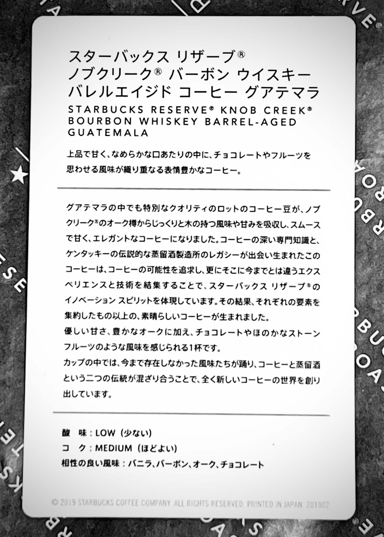 普段のスタバとは一味違う、厳選されたコーヒー体験が楽しめるスターバックス リザーブ®︎の「ノブクリーク®バーボン ウイスキーバレルエイジドコーヒー グアテマラ/STARBUCKS RESERVE® KNOB CREEK®BOURBON WHISKEY BARREL-AGED GUATEMALA」の備忘録。