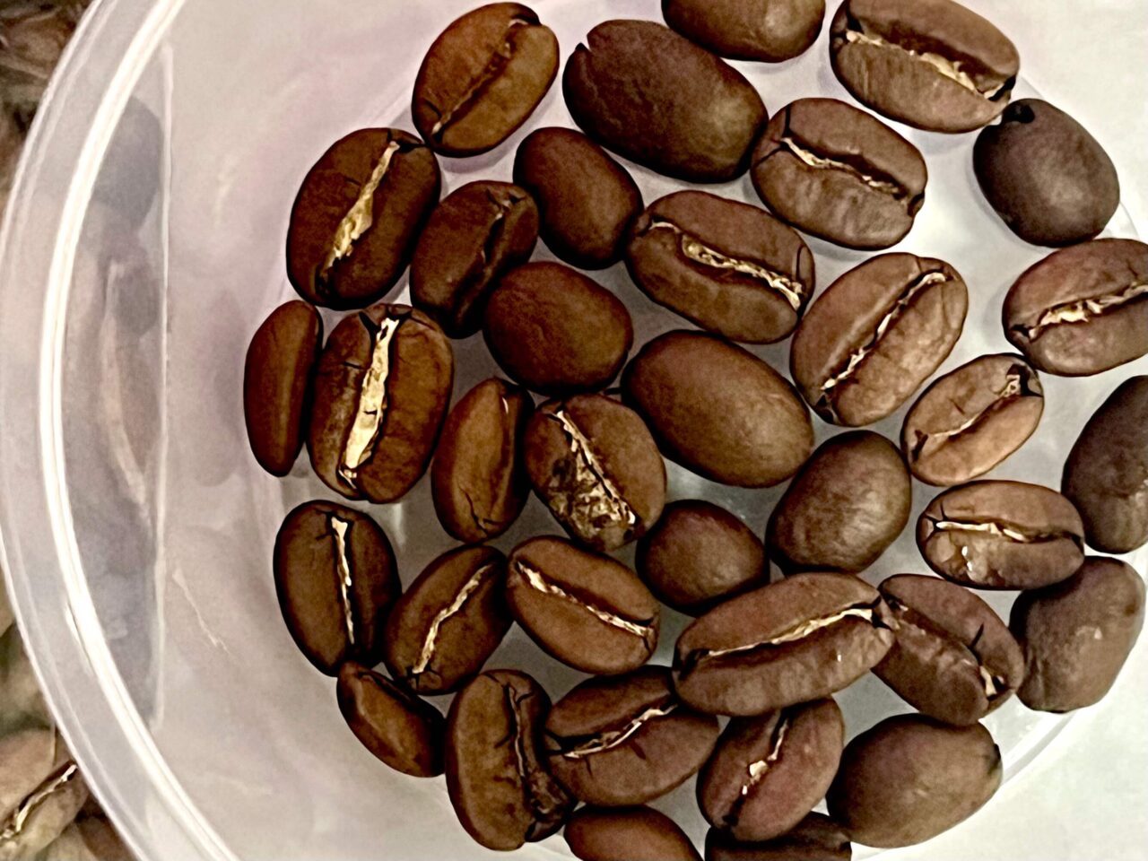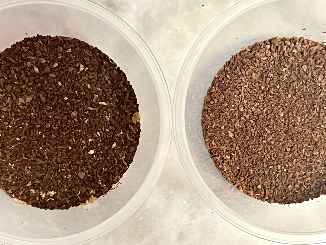 一方のグアテマラ EPW(画像左)は水洗式のため、白いセンターラインが混ざり、白っぽい粉の混入がはっきりわかります。こうして並べると、精選方法の違いは視覚的にも明確に現れるので試験でも粉の時点ですぐ見分けられるポイント。