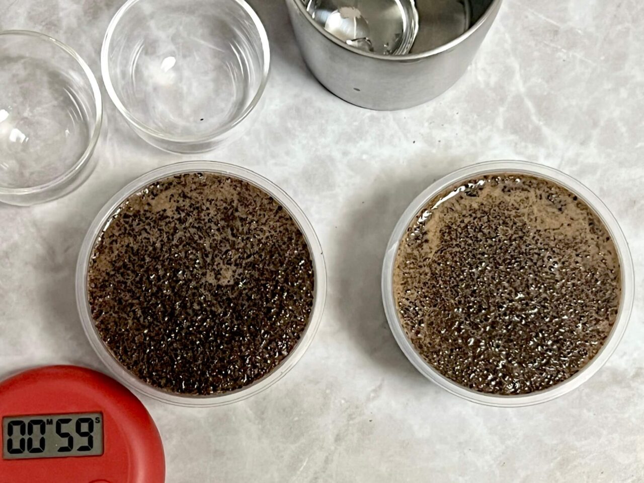 1日目のカッピング(ブラジル × エチオピア)は非水洗式同士でしたが、この日は、粉の見た目や香り、湯を注いだ後のクラスト、さらに温度が下がるにつれて変化する味わいにも明確な違いが。