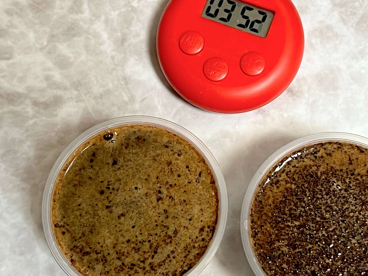 お湯を注いで4分後、すでにコロンビア(左)の粉は沈みが早く、表面に浮く粉の量に明確な違いが出ています。